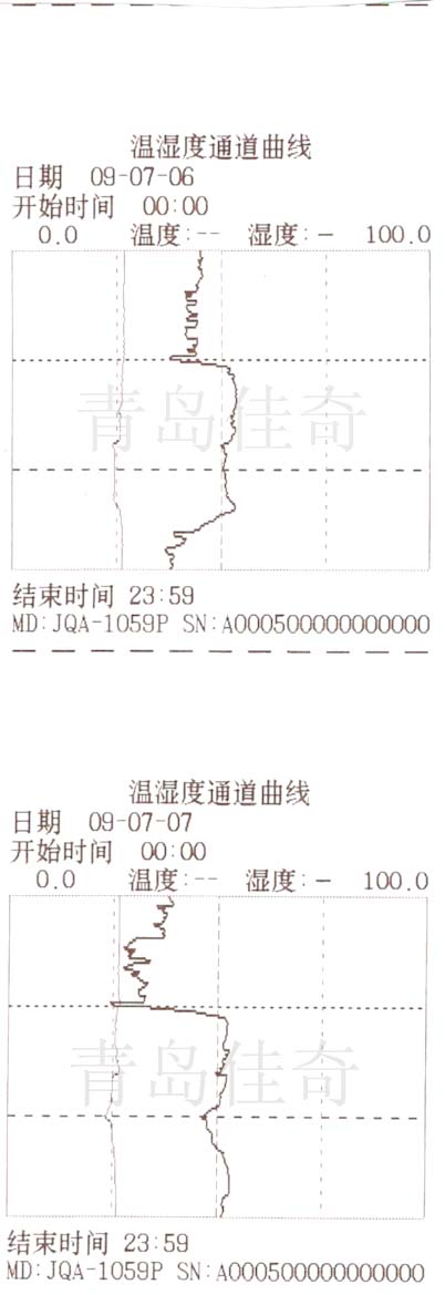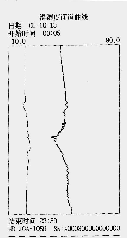 ● 圖中的曲線是每間隔5分鐘打印一次,一天24小時的溫濕度曲線。根據(jù)需要也可以只打印溫度或濕度曲線。